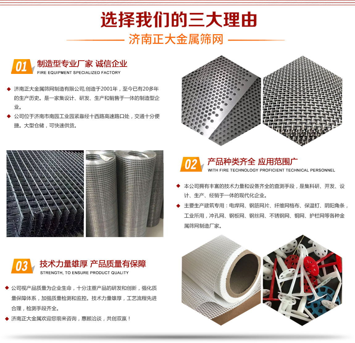 濟南正大金屬篩網制造有限公司,成立于2001年,至今已有20多年的生產歷史,主要生產建筑用:電焊網、鋼筋網片、纖維網格布、保溫釘、陰陽角條,工業所用,沖孔網、鋼板網、鋼絲網、不銹鋼網、銅網、護欄網等各種金屬篩網制造廠家。 本公司擁有豐富的技術力量和設備齊全的查測手段,是集科研、開發、設計、生產、經銷于一體的現代化企業。公司位于濟南市南園工業園緊靠經十西路高速路口處,交通十分便捷。